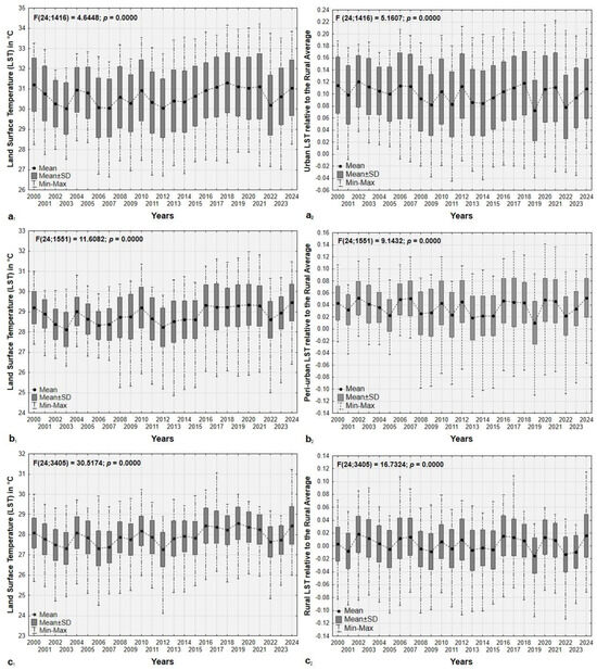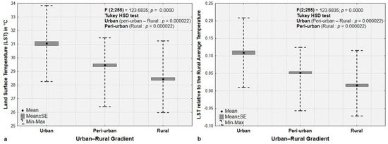 It is crucial to emphasize that variations in LST within urban, peri-urban, and rural environments directly influence fluctuations in the urban heat island (UHI), given that UHI is fundamentally dependent on LST. This explains the same level of significance as that observed in Figure 6. Therefore, strategies to mitigate high LST values should also be instrumental in narrowing the temperature disparities observed between urban, peri-urban, and rural areas.