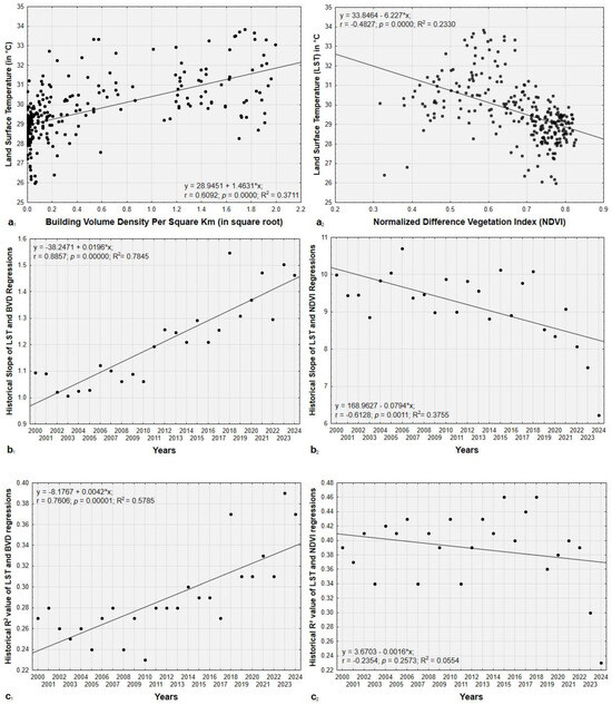Linear regression was performed between building volume density (BVD) and LST (a1); vegetation density expressed by NDVI and LST (a2); and the historical trends in the regressions’ slope (b1) and (b2) and coefficient of determination values (c1) and (c2). In a, each point corresponds to a pixel of 1 km2.