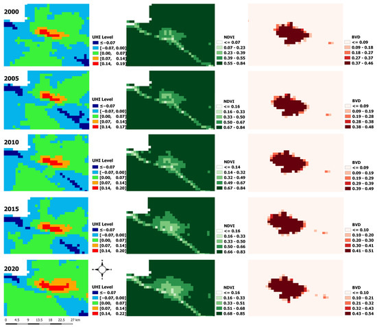 An illustration of the spatiotemporal evolution of the urban heat island (UHI), NDVI, and building volume density for a typical area (urban center of Kisangani).