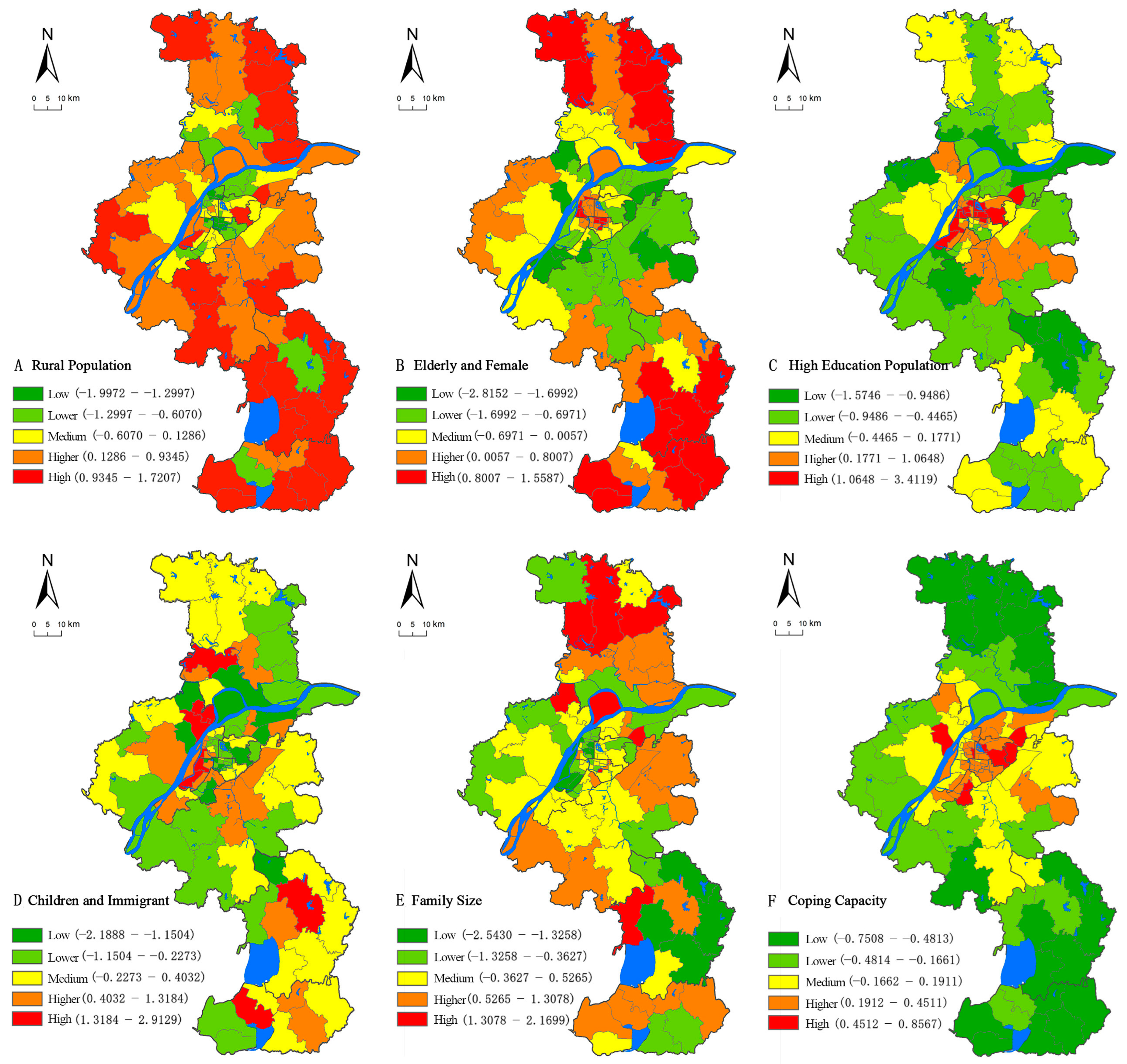 - Chen, Y.; Ye, Z.; Liu, H.; Chen, R.; Liu, Z. A GIS-based approach for flood risk zoning by combining social vulnerability and flood susceptibility: A case study of Nanjing, China. Int. J. Environ. Res. Public Health 2021, 18, 11597. [Google Scholar] [CrossRef]