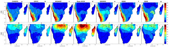 Climatological (1982–2014) spatial distribution of December-January-February (DJF) CDD (top row) and CWD (bottom row): (a,h) CHIRPS, (b,i) GPCC, (c,j) MSWEP, (d,k) multi-model ensemble (MME) of native simulations, (e,l) MME of QDM95, (f,m) MME of QDM, and (g,n) MME of SDM.