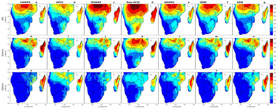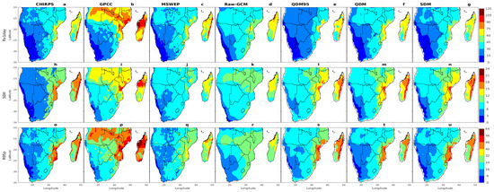 Significant differences were observed when comparing the multi-model ensemble (MME) means with the observational data, particularly between the results from native global climate models (GCMs) and those after bias correction in terms of the magnitude and spatial distribution of R95p. The native GCM results (Figure 4r) displayed considerable discrepancies with the observed datasets (Figure 4o,q), especially in regions such as the Lesotho Highlands, eastern Angola, and the northern and eastern parts of Southern Africa, including Madagascar. In these areas, discrepancies were noted where R95p values ranged from 24 to 32 mm. However, after employing bias correction techniques—namely QDM95, QDM, and SDM—the native GCM results were adjusted to correspond more closely with the observations, effectively reducing systematic biases. These corrections significantly enhanced the accuracy of the MME from the CMIP6 models, resulting in a more realistic representation of the observed spatial patterns of R95p. Notable improvements were particularly visible in regions such as Lesotho, Eswatini, coastal Angola, northern and central Southern Africa, and Madagascar, where the spatial distribution and magnitude of R95p better aligned with the CHIRPS (Figure 4o) and MSWEP (Figure 4q) datasets.