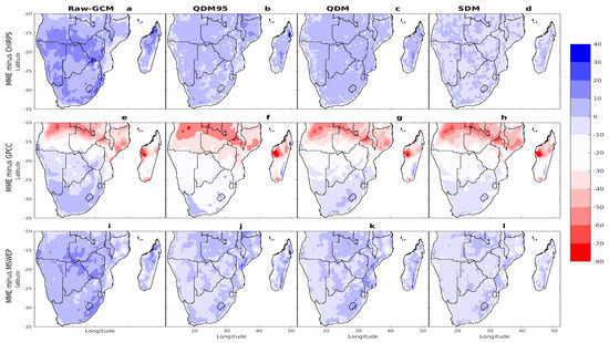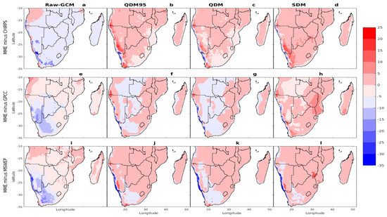 Figure 5, Figure 6, Figure 7 and Figure 8 present the spatial distribution of climatological biases for CDD, CWD, RR1, and Rx1day from native GCM ensemble and bias-corrected ensembles (QDM95, QDM, and SDM) relative to the observational datasets (CHIRPS, GPCC, and MSWEP). The native GCM MME (Figure 5a,e,i) exhibited significant underestimations of the CDD across most of Southern Africa, with biases ranging from −5 to −25 days, while overestimations were observed in coastal Angola (relative to CHIRPS and GPCC) and northern Mozambique and Madagascar (relative to MSWEP), with deviations of up to 5 days. These patterns were largely consistent across all three datasets, differing slightly in magnitude. After implementing bias correction techniques, substantial reductions in CDD biases were observed across the study region. For instance, the bias-corrected MME for CHIRPS (Figure 5b–d) reduced biases to a range from approximately −5 to +5 days, while corrections for GPCC (Figure 5f–h) and MSWEP (Figure 5j–l) reduced biases to a range from −10 to +10 days. Overall, the bias correction techniques significantly reduced the large deviations observed in the native GCM MME (Figure 5a,e,i), demonstrating improved alignment with observational datasets across most Southern Africa. Similarly, the native GCM MME significantly overestimated the CWD (Figure 6a,e,i) and RR1 (Figure 7a,e,i) across Southern Africa relative to CHIRPS, GPCC, and MSWEP. Specifically, relative to CHIRPS and GPCC, it overestimated the CWD by amounts exceeding 20 days in regions such as the northern parts of Southern Africa, the Lesotho Highlands, and Madagascar. In contrast, overestimations were observed throughout much of Southern Africa, with biases ranging from 0 to +15 days relative to MSWEP.