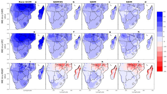 Furthermore, the spatial patterns of heavy precipitation days (R10mm) and extremely heavy precipitation days (R20mm) are shown in Figure 3h–n and Figure 3o–u, respectively. The highest number of days with precipitation exceeding 10 mm and 20 mm occurred along the east coast of Angola, Zambia, Malawi, Mozambique, and northern Zimbabwe, as well as in parts of northern and central Madagascar (Figure 3h–j,o–q). Both the native (Figure 3r–u) and bias-corrected (Figure 3k–n) CMIP6 models captured the general spatial patterns of heavy (R10mm) and extremely heavy (R20mm) precipitation days. However, notable discrepancies remained between the model simulations and observational datasets. Specifically, MSWEP tended to underestimate precipitation maxima associated with orographic features relative to CHIRPS and GPCC. Additionally, the native MME overestimated R10mm (R20mm) in northern Southern Africa and the northern and central highlands of Madagascar, with values exceeding 42 (9) days compared with approximately 36 (8) days in the gridded observations. Conversely, some of the bias-corrected models underestimated R10mm (R20mm) in these regions, with values below 30 (6) days compared with approximately 36 (8) days in the gridded observations. The overestimation and underestimation of RR1 and R10mm (R20mm) precipitation days in these regions may be attributed to the well-known inadequacies of the MME of CMIP6 models in accurately representing complex orographic processes. This issue persisted across all native MMEs, and similar biases in simulating extreme wet and dry precipitation over topographically complex regions have been reported in previous studies [27,44].
