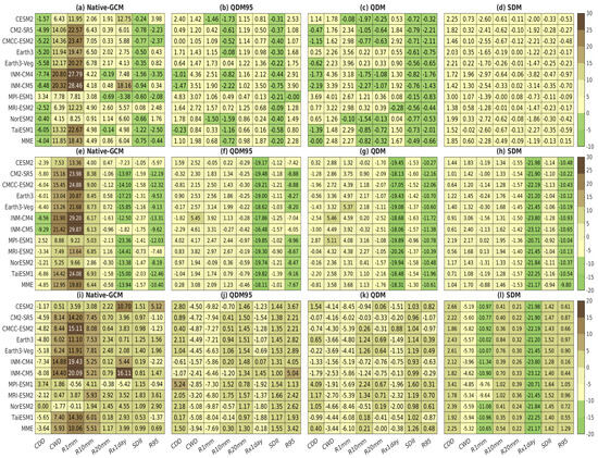 Figure 9a illustrates that most native CMIP6 models overestimated indices such as CWD, RR1, R10mm, R20mm, and Rx1day, resulting in positive mean biases (MB > 0). For R20mm, only INM-CM4, MPI-ESM1, and TaiESM1 exhibited negative biases of −0.19, −0.69, and −0.14, respectively. Conversely, all models and their MMEs underestimated CDD and SDII, except for MPI-ESM in the case of CDD and MRI-ESM2 in the case of SDII, which displayed positive biases. R95p showed a mix of over- and underestimations. For example, RR1 ranged from a significant overestimation of 7.8 days (MPI-ESM1) to 28.5 days (INM-CM5), while CWD ranged from 4.15 days (NorESM2) to 20.80 days (INM-CM4). Rx1day ranged from an underestimation of −3.38 mm (MPI-ESM1) to an overestimation of 18.16 mm (INM-CM5). These inconsistencies underscore the difficulty of native GCMs in accurately simulating RR1, CWD, Rx1day, and R95p (Figure 9a). After bias correction, the models generally underestimated most indices, particularly with the SDM technique. Nonetheless, significant reductions in biases were achieved for all extreme indices when using QDM95, QDM, and SDM, as shown in Figure 9b–d. For instance, the RR1 bias was reduced to a range from 0.33 days (TaiESM1) to 2.51 days (INM-CM4) for QDM95 (Figure 9b), from 0.22 days (Earth3) to −2.27 days (INM-CM5) for QDM (Figure 9c), and from −1.25 days (MRI-ESM2) to −2.97 days (INM-CM4) for SDM (Figure 9d).