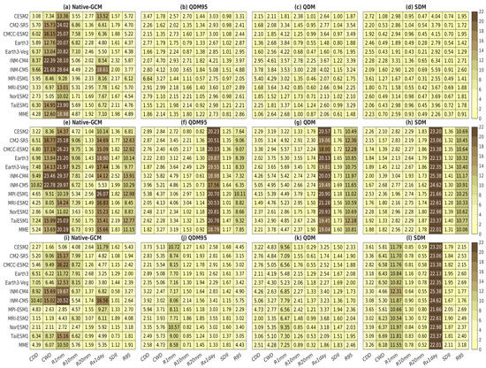 These results indicate that bias correction techniques improved the simulation of extreme precipitation indices compared with native models. However, the degree of improvement and the best-performing technique varied across the models and reference datasets. Earth3, Earth3-Veg, and MME consistently outperformed other models across the bias correction techniques, highlighting their reliability in simulating extreme precipitation. Likewise, MPI-ESM1, MRI-ESM2, and CMCC-ESM2 exhibited moderate performance across all three techniques, reinforcing their ability to capture extreme precipitation patterns. This is partly because climate models with higher resolutions generally exhibit improved accuracy in replicating observed extreme precipitation than those with coarser resolutions [65,75]. Nevertheless, Jima et al. [76] found that a higher resolution does not always guarantee better performance. In contrast, the performance of CESM2, CM2-SR5, NorESM2, and TaiESM1 fluctuated, demonstrating that bias correction did not always yield the best results across all metrics and datasets. While QDM95 and SDM offered notable improvements, the most effective technique depended on the specific model and reference dataset. However, some models, such as INM-CM4 and INM-CM5, consistently underperformed both before and after bias correction, highlighting inherent limitations in their ability to simulate extreme precipitation accurately. This finding aligns with previous research [44,77,78], which reported similar performance issues with lower-resolution models, suggesting a fundamental challenge in capturing extreme precipitation.
