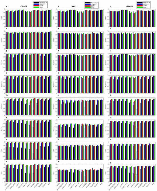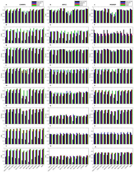 Pattern correlation coefficient (PCC) for (a–c) consecutive dry days (CDD), (d–f) consecutive wet days (CWD), (g–i) total rain days (RR1), (j–l) heavy precipitation days (R10mm), (m–o) extremely heavy precipitation days (R20mm), (p–r) maximum one-day precipitation (RX1day), (s–u) simple daily intensity index (SDII), and (v–x) extremely wet days (R95p) relative to CHIRPS (first column), GPCC (second column), and MSWEP (third column).