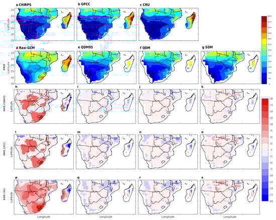 A comparison of the average seasonal precipitation differences among the three observational datasets and the average results from raw GCM, as well as the three bias-corrected techniques from the CMIP6 simulations, is presented in Figure 2h–s. There are significant overestimations in high-altitude areas such as the Lesotho–Eswatini region, western and central Madagascar, coastal Angola, and central Southern Africa, while there are notable underestimations along the east coast of Madagascar (Figure 2h,l,p). These significant discrepancies highlight the challenges models face in accurately simulating precipitation in complex terrain [31,71]. The extensive areas of under- and overestimation are considerably reduced from 200 mm to ≤50 mm after bias correction compared to CHIRPS, the GPCC, and the CRU (Figure 2i–k, 2m–o, and 2q–s, respectively). For example, Figure 2i–k for MME-CHIRPS indicate a generally lower dry bias across northern Angola and Zambia, central Mozambique, and the east coast of Madagascar when compared to Figure 2m–o,q–s. The MME-GPCC (Figure 2m–o) and MME-CRU (Figure 2q–s) show similar precipitation patterns, with the MME-GPCC exhibiting slightly less dry bias than the MME-CRU but more than MME-CHIRPS (Figure 2i–k). The differences in the bias of the MME of bias-corrected DJF precipitation, relative to the three observation datasets, demonstrate inherent variations among the observations. This is evident in the lower bias relative to CHIRPS compared to the GPCC and CRU. Overall, the ensemble means of precipitation from the three bias-corrected techniques showed consistent improvement in most study areas, except for a few regions.