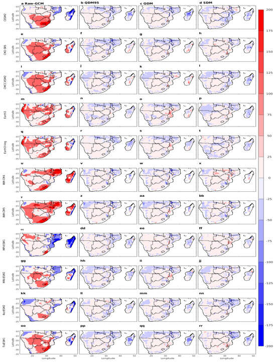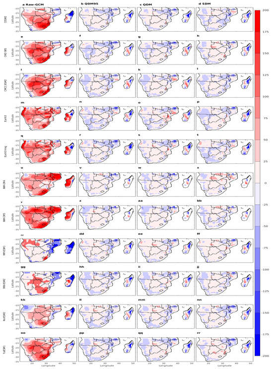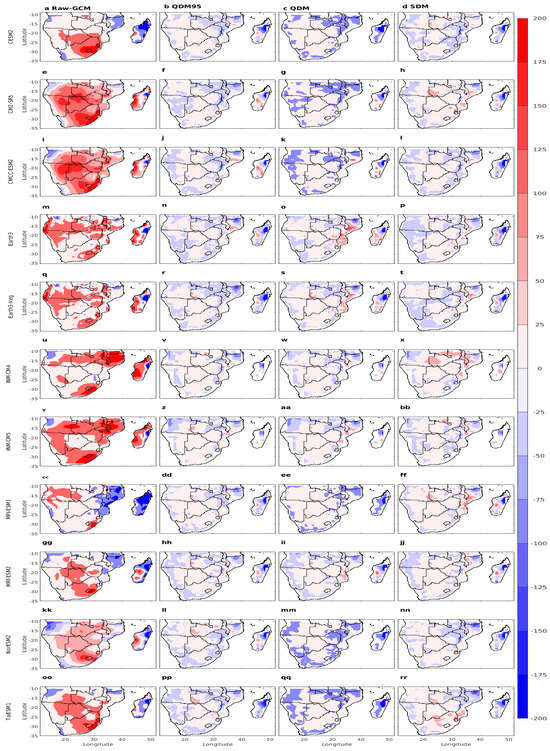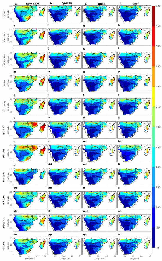 Figure 3 shows the climatological spatial distribution of the mean monthly precipitation during DJF from all eleven CMIP6 models for raw GCM (first column) and the three bias correction techniques (last three columns). The coupled GCM models have captured the observed spatial patterns of precipitation except for wet bias over most parts of the region (Figure 3a,e,i,m,q,u,y,cc,gg,kk,oo). For example, the drier western region of Southern Africa receives less precipitation than the eastern half of Southern Africa and Madagascar. These results agree with the findings of Sian et al. [17], Engelbrecht et al. [31], who found that GCMs generally capture annual precipitation variation apart from the tendency to overestimate, especially in high-elevation areas. However, neither the magnitude nor the spatial distribution of the wet bias among the model is the same. For example, the wet bias over northern Mozambique and Madagascar from INM-CM4 and INM-CM5 (Figure 3u,y) is the highest, reaching as high as twice the climatological mean of DJF. Moreover, the two models do not capture the apparent east–west precipitation gradient over Madagascar in the observation. Specifically, the bias-uncorrected CMIP6 models (Figure 3a,e,i,m,q,u,y,cc,gg,kk,oo) simulated significantly overestimated precipitation over the northern half of Southern Africa, coastal Angola, Lesotho, Eswatini, Mozambique, and Madagascar relative to the three observation datasets in Figure 2a–c. Similar overestimations have been reported in earlier studies, where GCMs tend to misrepresent orographic and convective rainfall, particularly in regions with complex topography and strong mesoscale dynamics [71]. The three bias correction techniques (QDM95, QDM, and SDM) were able to replicate the precipitation from the CMIP6 GCM models (Figure 3, columns 2–4) quite accurately across most of Southern Africa, except Madagascar. In Madagascar, the bias correction did not produce satisfactory results. This could be attributed to limitations in correcting biases where model error stems from structural rather than statistical sources [72]. All three bias correction techniques (QDM95, QDM, and SDM) effectively reduced the mean precipitation values in the CMIP6 GCM models, making them comparable with the observed values, unlike the original raw models. Specifically, QDM95 and QDM reduced the wet bias over Madagascar and the coastal regions. Additionally, QDM reduced the wet bias in precipitation in northern Southern Africa. SDM led to the most uniform precipitation distribution across the region. Sian et al. [15] also used the quantile mapping using gamma distribution to correct bias in the daily precipitation estimates from different sets of CMIP6 models over Southern Africa. Their findings indicated an improvement in the bias-corrected precipitation across Southern Africa consistent, for the large part, with our findings. Precipitation processes are often subject to shifting statistical properties over time, driven by changes in circulation patterns, land–atmosphere interactions, and anthropogenic forcings [73]. Such nonstationarity poses challenges for bias correction methods that assume a stable statistical relationship between model simulations and observations across historical and future periods. In this regard, the quantile delta mapping approaches, which allow for change-preserving adjustments, are generally preferred for climate impact studies [74] or more complex approaches involving nonstationary QM (NS-QM) and its simplified version, consistent nonstationarity patterns (CNS-QM) [75].