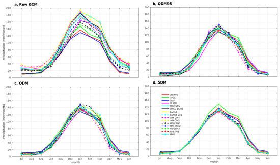 Annual cycle of mean monthly precipitation in Southern Africa for the period 1982–2014 based on the GPCC, CHIRPS, CRU, and eleven CMIP6 raw GCM (bias-uncorrected) and three different bias correction techniques. Panel (a) presents the uncorrected raw General Circulation Model (GCM) output. Panel (b) displays results using quantile distribution mapping at the 95th percentile (QDM95). Panel (c) shows quantile distribution mapping (QDM). Finally, panel (d) illustrates the scaled distribution mapping (SDM).
