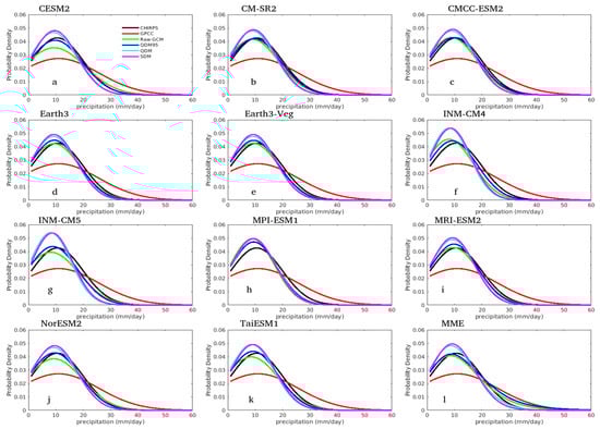 The probability density of the observed DJF precipitation over Southern Africa during 1982–2014 is compared among the CHIRPS and GPCC datasets, along with the uncorrected and bias-corrected CMIP6 GCM models:(a) CESM2, (b)CM-SR5, (c) CMCC-ESM2, (d) Earth3, (e) Earth3-Veg, (f) INM-CM4, (g) INM-CM5, (h) MPI-ESM1, (i) MRI-ESM2, (j) NorESM2, (k) TaiESM1, and (l) MME.