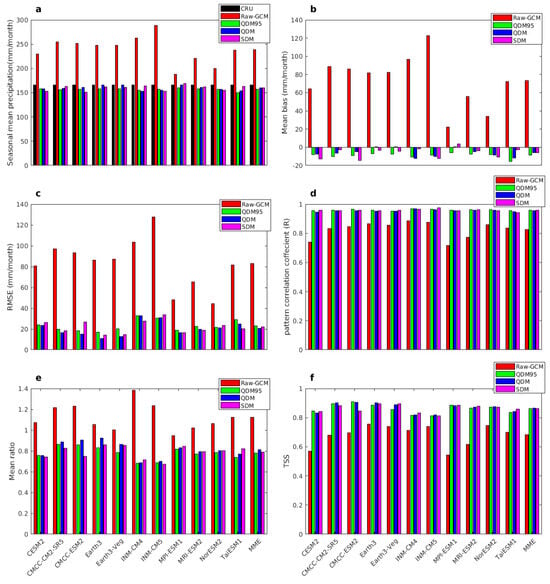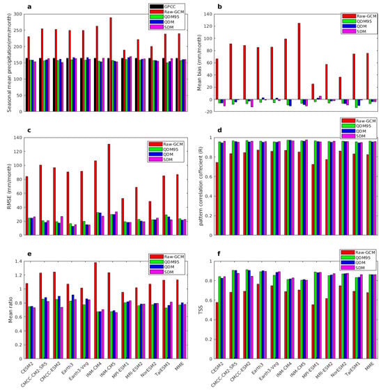 Statistical scores for the DJF seasonal mean precipitation (a), MB (b), RMSE (c) and R (d), mean ratio (e), and TSS (f) compared to the CHIRPS data, respectively, for both the bias-corrected (i.e., QDM95, QDM, and SDM) and bias-uncorrected (raw-GCM) CMIP6 model results over Southern Africa from 1982 to 2014.
