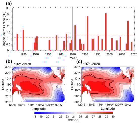 (a) The magnitude of El Niño measured by the sea surface temperature (SST) anomalies in the eastern equatorial Pacific (5° S–5° N, 155° W–70° W). Red dashed lines indicate the average magnitude of El Niño events during 1921–1970 and 1971–2020, respectively. (b,c) Composite SST structures during El Niño events for 1921–1970 (b) and 1971–2020 (c). The black dashed line indicates the position of the climatological 28 °C isotherm, while the black solid line denotes the 28 °C isotherm during El Niño events. An El Niño event is identified when the average SST anomaly in the eastern equatorial Pacific during the boreal winter (November–January) exceeds 0.5 °C.