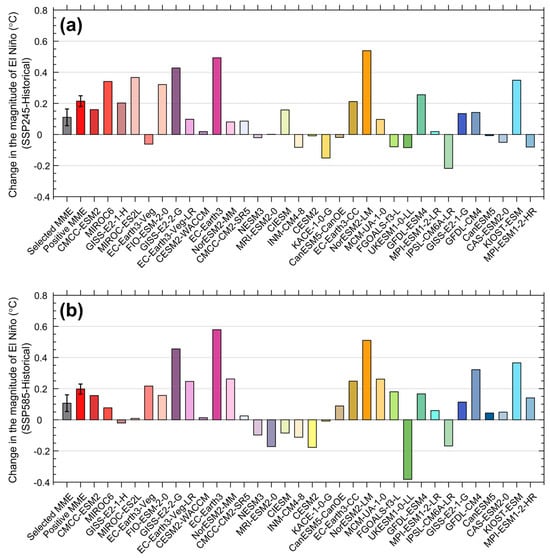 The MME mean projects a stronger magnitude of El Niño under future warming scenarios (Figure 2). The changes shown in Figure 2 are quantified as the difference between the mean El Niño magnitude in the SSP245 (or SSP585) scenario and that in the historical simulations. In the context of the SSP245 scenario, the MME indicates an increase of 0.11 ± 0.05 °C, with individual model projections ranging from –0.22 °C to +0.54 °C (Figure 2a). Among the 33 models, 21 project an increase in El Niño intensity, with an average increase of 0.21 ± 0.03 °C and a spread from +0.00 °C to +0.54 °C. The NorESM2-LM model demonstrates the most substantial increase in El Niño magnitude, while the IPSL-CM6A-LR model displays the most pronounced decrease in El Niño magnitude. Under the SSP585 scenario, the MME mean indicates a 0.11 ± 0.05 °C increase in El Niño intensity but with a wider spread from –0.38 °C to +0.58 °C (Figure 2b). In this scenario, 24 models project an increase in El Niño magnitude, with an average increase of 0.20 ± 0.03 °C and a spread from +0.01 °C to +0.58 °C. The model with the largest increase in El Niño intensity is the EC-Earth3, and the model with the largest decrease is the UKESM1-0-LL. The CESM2-WACCM model shows little change in the El Niño magnitude under both scenarios, suggesting that El Niño in this model is not sensitive to global warming. The significant differences among the models may indicate that they are in different dynamic regimes [28,29].