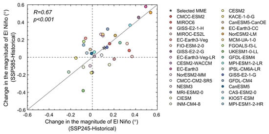 Scatter plot illustrating the relationship between changes in the magnitude of El Niño from the historical simulation run to the SSP245 scenario and the SSP585 scenario. The MME mean is represented by the gray pentagram, and individual models are represented by the other colored dots. The least squares regression line is presented in gray. R symbolizes the correlation coefficient, and p represents the confidence level.