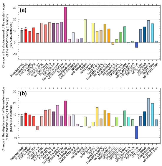 Projected changes in the displacement of the WPWP boundary during El Niño events: (a) from the historical run to the SSP245 scenario and (b) from the historical period to the SSP585 scenario. The gray bar represents the MME mean, with the error bar (black symbol) indicating the standard deviation across models. The bright red bar shows the MME mean of models with positive values, with the corresponding black error bar representing the inter-model standard deviation within this subset. Results from individual models are presented by colored bars. An enhanced eastward displacement of the WPWP’s eastern boundary is indicated by positive values, while a reduced displacement is signaled by negative values.