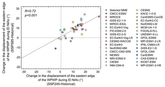 For all models, consistency analysis reveals that 28 models agree on the direction of WPWP displacement changes in response to both SSP245 and SSP585 scenarios (Figure 5). Figure 5 illustrates the correlation between changes in WPWP boundary displacement under the SSP245 and SSP585 scenarios. A correlation coefficient of 0.72, statistically significant at the 99.9% confidence level, supports the conclusion that global warming leads to an enhanced eastward displacement of the WPWP boundary. Among the 33 models analyzed, 26 consistently project an increase in WPWP displacement under both SSP245 and SSP585 scenarios. These include CMCC-ESM2, MIROC6, MIROC-ES2L, EC-Earth3-Veg, FIO-ESM-2-0, GISS-E2-2-G, EC-Earth3-Veg-LR, CESM2-WACCM, EC-Earth3, NorESM2-MM, CMCC-CM2-SR5, NESM3, CIESM, CESM2, KACE-1-0-G, CanESM5-CanOE, EC-Earth3-CC, NorESM2-LM, FGOALS-f3-L, GFDL-ESM4, IPSL-CM6A-LR, GFDL-CM4, CanESM5, CAS-ESM2-0, KIOST-ESM, and MPI-ESM1-2-HR. By contrast, GISS-E2-1-G and MCM-UA-1-0 consistently project a decrease under both scenarios. The remaining five models—GISS-E2-1-H, INM-CM4-8, MPI-ESM1-2-LR, MRI-ESM2-0, and UKESM1-0-LL—exhibit scenario-dependent behavior. Notably, the INM-CM4-8 model exhibits minimal change in the displacement of the WPWP eastern boundary under both warming scenarios.