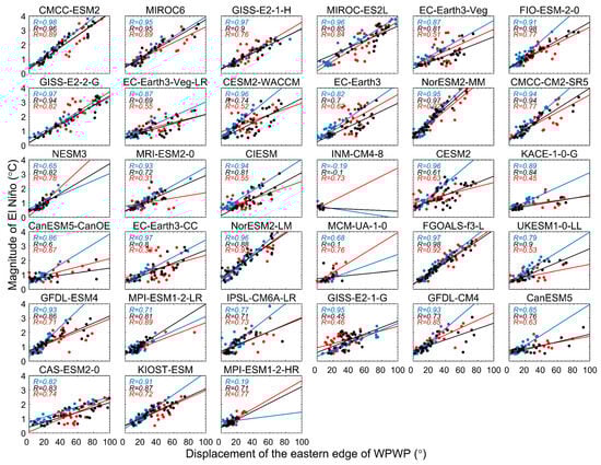 Relationship between El Niño magnitude and the eastward displacement of the eastern edge of the WPWP during El Niño events under the historical run (blue), the SSP245 scenario (black), and the SSP585 scenario (red). Linear regression lines are shown in corresponding colors. The correlation coefficients (R) for each scenario are also indicated in blue (historical), black (SSP245), and red (SSP585).