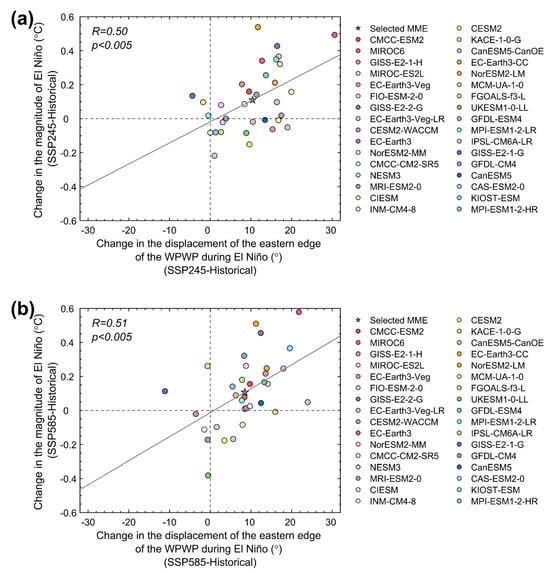 Inter-model relationship between projected changes in El Niño magnitude and the displacement of the eastern edge of the WPWP during El Niño events: (a) from the historical run to the SSP245 scenario and (b) from the historical run to the SSP585 scenario. The MME mean is represented by the gray pentagram, and individual models are shown as colored dots. The gray line indicates the least-squares linear regression fit. The correlation coefficient (R) and significance level (p) are also provided. Positive values indicate an increase relative to the historical period.
