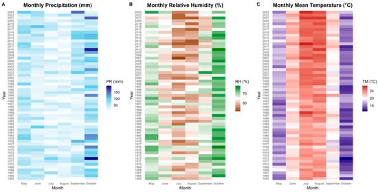 Monthly density maps over Greece for the period May–October, 1965–2023: (A) precipitation, showing the temporal distribution of monthly rainfall; (B) relative humidity, illustrating average monthly humidity levels; and (C) temperature, representing the temporal variation of average monthly air temperatures.