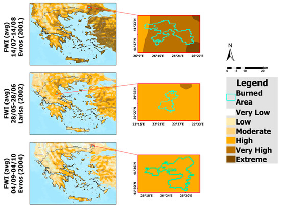 Subsequently, this study proceeded with an evaluation of the data obtained from the Copernicus Climate Change Service (C3S) platform, focusing on three major wildfire events in Greece. The aim was to assess whether the FWI values one month prior to each event could serve as a signal. These events included two forest fires in the Evros region (northeastern Greece) on 15 August 2001 and 5 October 2004, and a wildfire in Larisa (central Greece) on 29 June 2002. The investigation compared the occurrences of these fires with the average FWI for the month preceding each event, with the results presented in Figure 3.