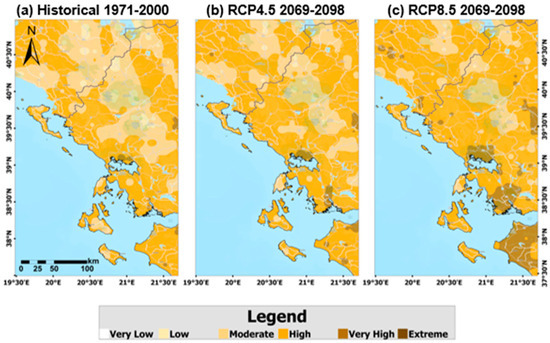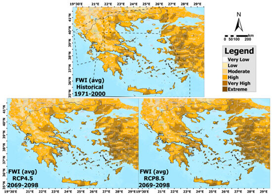To assess wildfire risk in Greece, the average Fire Weather Index (FWI) values for the fire season (May–October) were analyzed. This assessment includes both historical data from the 30-year period 1971–2000 and projections based on the RCP4.5 and RCP8.5 scenarios for the 30-year period 2069–2098 (Figure 4). The results reveal a marked upward trend in fire weather risk, particularly under the high-emission RCP8.5 scenario, indicating an increasing likelihood of extreme fire conditions in Greece in the latter part of the 21st century.