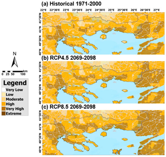 Regarding the regions of central and eastern Macedonia and Thrace, these areas appear to be affected to some extent, particularly under the RCP8.5 scenario, with an increase in regions transitioning in the fire risk index from “high” to “very high” and, in some cases, to “extreme.” Notably, in the areas of the central part of the region of Macedonia in northern Greece, as well as along the eastern border of Macedonia with western Thrace, and in the far eastern end of the country, the Evros region, the fire risk is increased (Figure 6). This increase in fire risk is particularly significant in the Evros region, which is characterized by a variety of vegetation types, including forests and agricultural lands that can serve as fuel for wildfires. Dense forests, especially in the mountainous areas, further elevate the vulnerability to fire. A characteristic example of this vulnerability is the severe “Evros fire” of 2023, one of the largest wildfires in the EU. This fire burned approximately 90,000 ha [53], affecting over 50% of the Dadia National Park, a region renowned for its rich biodiversity and as a habitat for various bird species.