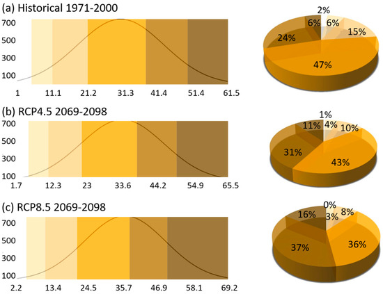 Statistical analysis using a normal distribution provides an illustrative view of projected changes in fire risk distribution, as shown in Figure 8. The lower fire risk categories (“moderate”, “low”, and “very low”) decline significantly in both future scenarios compared to the historical period (1971–2000), indicating a reduction in areas with minimal fire risk. Similarly, the “high” fire risk class decreases from 47% in the historical period to 43% under RCP4.5 and 36% under RCP8.5. In contrast, the most severe fire risk categories increase considerably. The “very high” fire risk class rises from 24% historically to 31% under RCP4.5 and 37% under RCP8.5, while the “extreme” fire risk class rises sharply from 4% to 11% and 16% under RCP4.5 and RCP8.5, respectively. This redistribution indicates a clear shift from lower to higher fire risk categories, particularly in southern and central Greece, driven by rising temperatures and intensified drought conditions associated with climate change.
