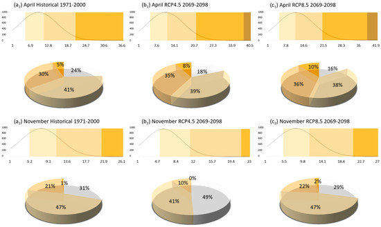 Changes in fire risk during April and November for the period 2069–2098 were assessed under two emissions scenarios. A statistical comparison based on normal distribution analysis was conducted to evaluate differences between historical conditions and future projections (Figure 10). The results indicate that, during the reference period, there were no recorded instances of “high”, “very high”, or “extreme” fire danger levels in either month. Most Fire Weather Index values fell within the “moderate” category, representing 41% in April and 47% in November.