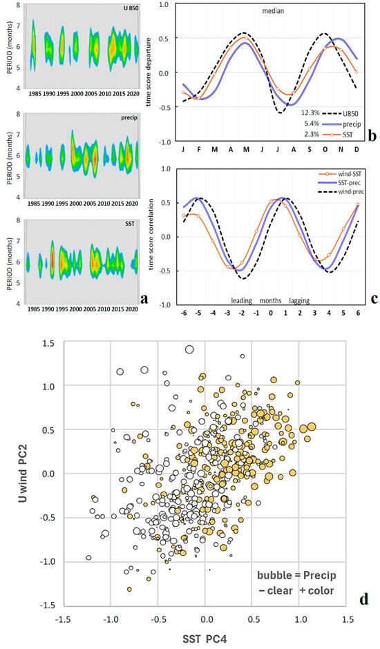 (a) The amplitudes of the semi-annual cycles (wavelet spectral power shaded > 90% confidence) in the PC time scores (from top to bottom: U850 wind, precipitation, and SST). (b) The monthly medians of the PC time scores. (c) The pair-wise lag correlations between the semi-annual PC time scores. (d) A scatterplot of the 1980–2023 monthly PC time scores (R = 0.46), with colors and sizes according to precipitation.