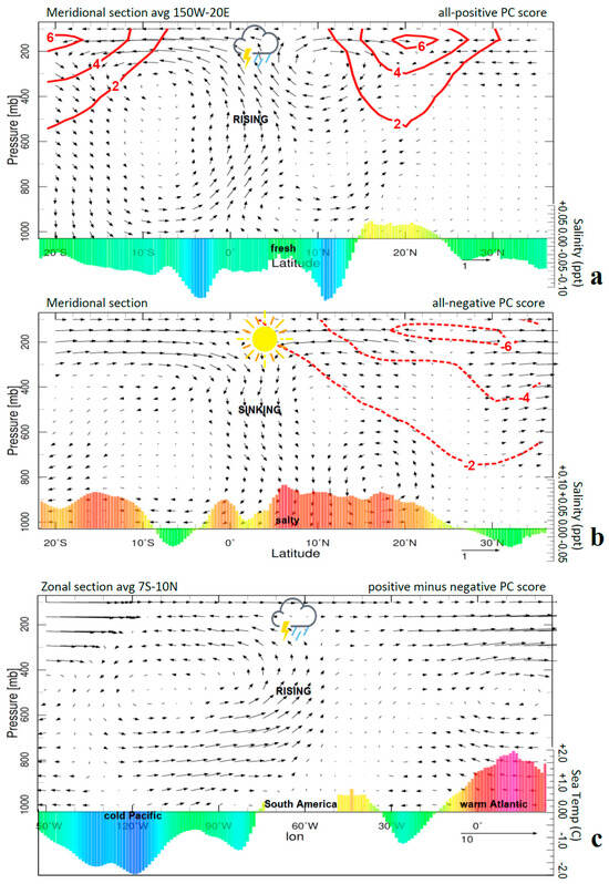 The summed and ranked PC scores identified the 10 most positive and negative months of semi-annual oscillation across the Western Hemisphere. They are composited in Figure 6a,b to illustrate meridional climate anomalies. During the positive phase, there is a widespread rising motion over the equatorial zone (3 S–7 N) supported by the meridional Hadley cells (mainly the southern cell). The subtropical jets are strengthened (+6 m/s at 20 S and 20 N), and the tropical upper ocean is fresh due to enhanced precipitation and runoff. During the negative phase, there is a sinking motion over the equatorial zone (0–7 N) and a weakened northern subtropical jet (−6 m/s from 20 to 30 N). The upper ocean is salty from 20 S to 20 N due to suppressed moist convection. Differences in zonal circulation and upper-ocean temperature are presented in Figure 6c as a positive minus negative composite averaged for 7 S to 10 N. The cold Pacific/warm Atlantic pattern underlies counter-rotating Walker cells that instill a rising motion. Upper-level divergence between Pacific easterlies and Atlantic westerlies is a noteworthy influence on the semi-annual modes.
