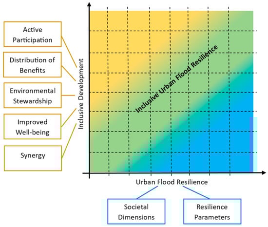 Using a color scheme of yellow for inclusive development and blue for urban flood resilience, the framework shows that measures of inclusive urban flood resilience reside at the intersections of the various levels of inclusive development and urban flood resilience. Such measures can be obtained by composite indices that account for both axes. A composite index showing high resilience scores but low inclusive development scores will fall in the blue region, and corresponds to the kinds of resilience inequalities mentioned in the literature. Similarly, an overemphasis on inclusive development without much resilience planning and actions will produce a composite index value in the yellow region. Stronger correlations between improvements in inclusive development and urban flood resilience are considered ideal and will produce composite index scores within the shades of green in the framework. Moreover, considering that both inclusive development and urban flood resilience are dynamic processes [10,84], this framework likewise positions inclusive urban flood resilience as a dynamic process and outcome of development.