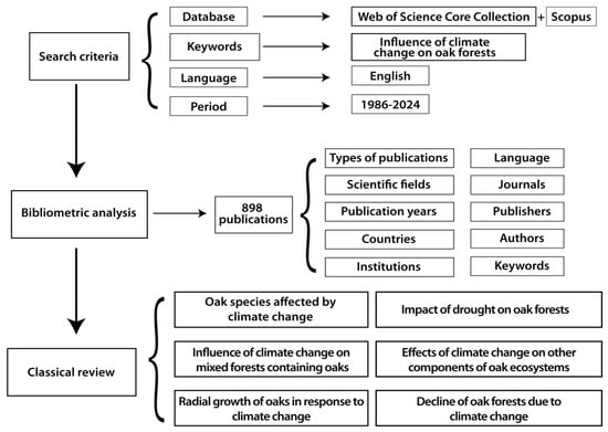 The first part of this study involved a bibliometric analysis to assess global scientific research on the impact of climate change on oak forests from 1976 to 2024. We conducted our analysis using the Science Citation Index Expanded (SCI-Expanded) within the Web of Science database, as well as Scopus, to identify relevant publications.