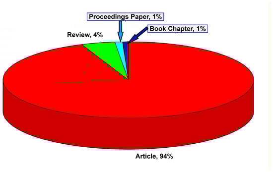 From the analysis of the types of publications (898) in which the articles on the impact of climate change on oak forests are classified, it is observed that the largest number are research articles (638 articles, 94% of the total publications), followed by 32 reviews (4%), while proceedings papers and book chapters represent 1% (Figure 2).