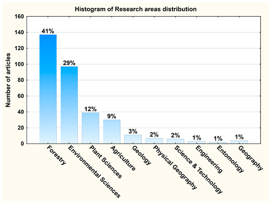 We have identified 36 research areas in which we can frame the published articles. The most representative areas are Forestry (41%), Environmental Sciences (29%), and Plant Sciences (12%) (Figure 3).