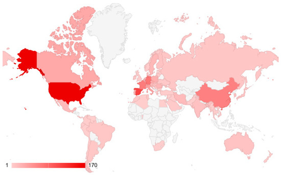 Authors from 77 countries have published articles on this topic. The most well-represented countries are the USA, Spain, Germany, France, and China (Figure 5).