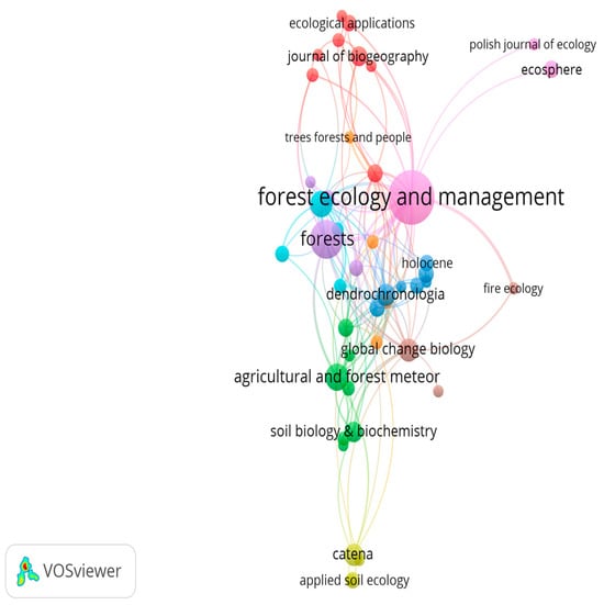 The journals with the greatest number and most significant articles published on the impact of climate change on oak forests are Forest Ecology and Management, Forests, Science of the Total Environment, and Agricultural and Forest Meteorology (Table 1 and Figure 7).