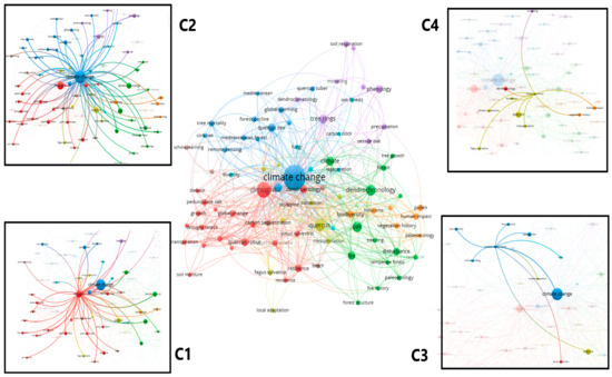 Authors’ keywords related to the impact of climate change on oak forests C1 = first cluster: C2 = second cluster; C3 = third cluster; C4 = fourth cluster.