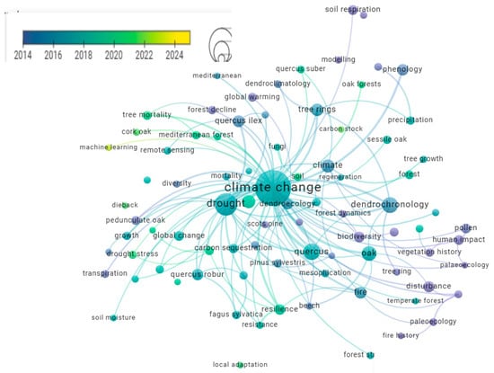 Regarding the evolution over time of keyword usage, it can be observed that in the early period (2015–2016), the most commonly used words were vegetation, disturbance, carbon, and fire. In the middle period (2017–2018), the predominant keywords were climate change, oak, biodiversity, patterns, and tree. In the most recent period (2019–2024), the keywords used were temperature, precipitation, drought, radial growth, and soil (Figure 9).