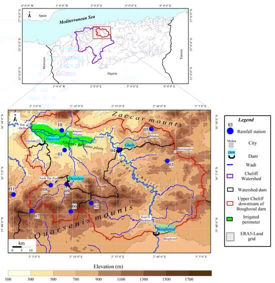 The Upper Cheliff located downstream of the Boughzoul dam (in the north-east of Cheliff basin) covers an area of 4777 km2, bounded by two mountain ranges, the Zaccar to the north and the Ouarsenis to the south. According to the digital elevation model (DEM) of north Algeria, with a resolution of 100 m, validated by Rezak et al. [50], the relief varies from 250 (Khemis Miliana plain) to over 1600 m (Ouarsenis mountains) (Figure 1).