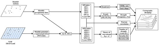 (1) Calculation of SPI and SPEI at different time scales (1 year, 1 month, 3 months, 6 months, 9 months and 12 months) based on precipitation and evapotranspiration and the application of a Modified Mann–Kendall test (MMK trend test) and Sen Slope to determine drought trend;