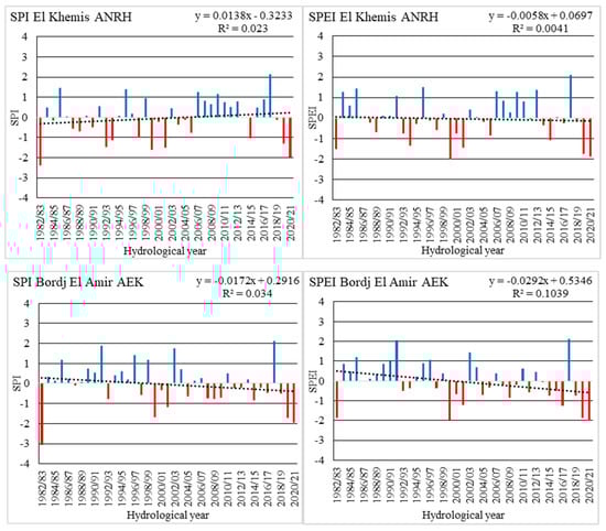 One-year SPI and SPEI for the rainfall stations (El Khemis ANRH, Bordj El Amir AEK and Medea Secteur) from 1982/83 to 2020/21.