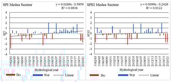 Monthly series of SPI and SPEI for the Derrag station from 1982/83 to 2020/21.