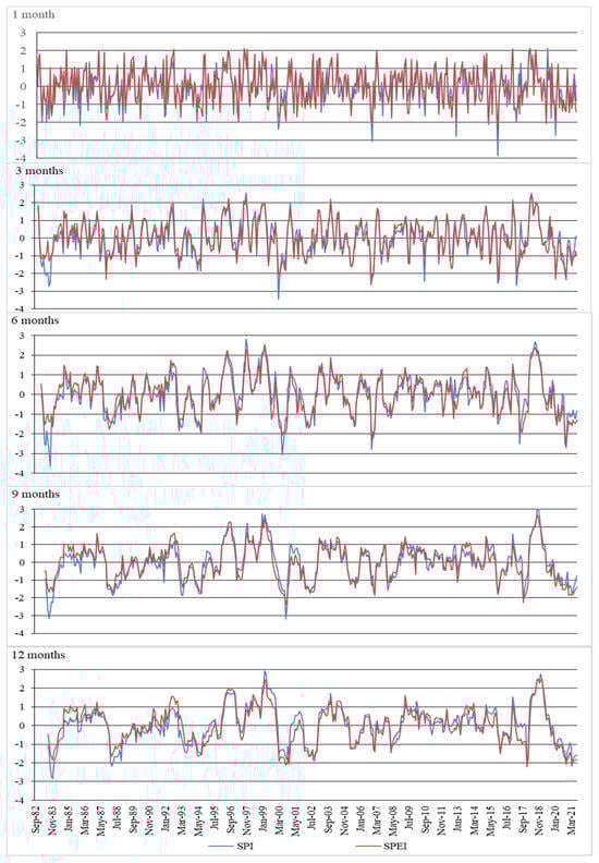 The analysis of monthly time series of two meteorological drought indices (SPI and SPEI) provides a more detailed study of drought levels over time. Figure 4 shows the course of monthly SPI and SPEI values in different time scales (1, 3, 6, 9 and 12 months) for the Derrag station from September 1982 to August 2021. It was found that SPI and SPEI values show fluctuations in both wet and dry periods even within the same year. The minimum SPI values are lower than SPEI values, which is especially visible in shorter time scales in dry periods. In the case of the 1-month time scale, the minimum SPI 1 value is −3.87, while the minimum SPEI 1 value is −2.42 (December 2015). In the 3-month time scale, the minimum SPI 3 value is −3.53, while SPEI 3 is −1.79. In the remaining time scales (6, 9 and 12 months), smaller discrepancies in the course of SPI and SPEI values are observed, and thus there is a better match between SPI and SPEI values. In turn, the maximum SPI values are lower than the maximum SPEI values at the same time in wet periods. Meteorological droughts in short time scales are more intense and characterized by a relatively short duration. Information about other stations is given in the Supplementary Materials (Figures S5–S14).