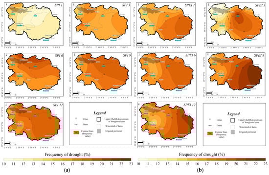 To better understand the drought pattern in the study area, monthly analysis of SPI and SPEI values was performed. Both indices show that the drought frequency reached 23% in the 12-month time scale in the upper Cheliff basin. These values are compared with studies in the other regions in the word. Simsek et al. [17] showed that the frequency is greater than 30% in the Black Sea region, Turkey. In the north part of Poland, which is characterized by wet conditions, Kubiak-Wójcicka et al. [16] showed that the frequency of meteorological droughts is greater than 28% at different time scales. Liu et al. [4] showed that the frequency did not exceed 20% in Sichuan Province, China, which is characterized by drier conditions than the upper Cheliff.