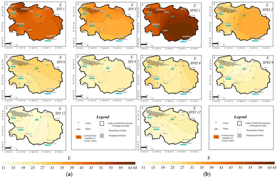 The number of events (Es) observed by SPI varies, according to the time scale, between 15 and 48 events in Derrag station, from 19 to 49 events in Khemis ITGC station and from 15 to 48 events in Theniet El Had station. However, the number of Es observed by SPEI varies from 14 to 62 events in Derrag station, from 18 to 52 events in Khemis ITGC station and from 22 to 48 events in Theniet El Had station. Information about other stations is given in the Supplementary Materials (Table S1).