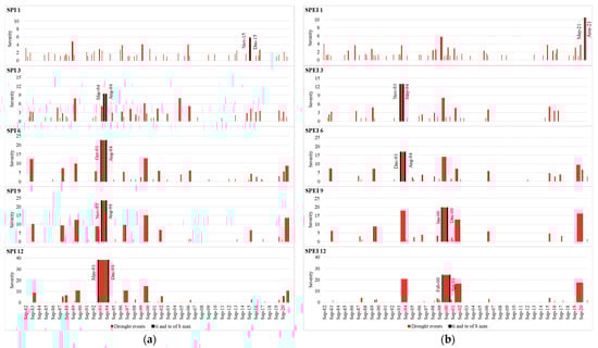 Based on the theory of run concept, the results showed that the number of drought events decreases in longer time scales (6, 9 and 12 months). However, they increase in shorter time scales (1 and 3 months). However, severity and duration increase during longer time scales. Comparing the two indices, SPEI estimates longer and more severe drought events than SPI by showing the influence of temperature in time and space. This has been confirmed by several studies [36,37,97].