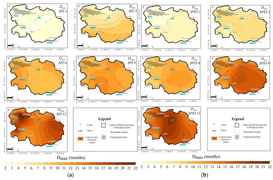 Spatial variation in the maximum duration of a meteorological drought event (1982/83–2020/21). (a) SPI; (b) SPEI.
