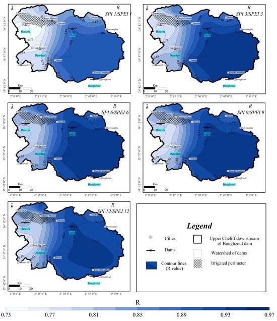 The spatial distribution of the Pearson correlation coefficient between SPI and SPEI at different time scales is shown in Figure 10 and Table S2. The Pearson index values ranged from 0.73 to 0.97. The higher correlation values indicate the consistency between SPI, which takes into account only precipitation, and SPEI, which takes into account both precipitation and evaporation. When the correlation coefficient is equal to or higher than 0.8, a significant positive association is assumed [86,87]. The high values (>0.80) were recorded in the eastern part of the basin in the mountainous areas, while lower values (<0.80) were recorded in the western part of the basin in the lowlands. As a function of time scale, areas with R less than 0.80 were larger on longer time scales, while on shorter time scales these areas were smaller.