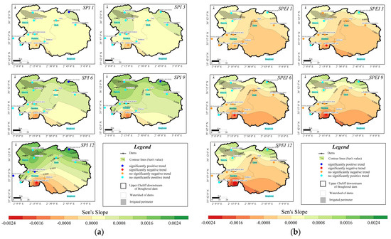 Result of MMK trend test and Sen’s slope for SPI (a) and SPEI (b).